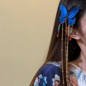 刺繍蝶|新中国風エスニック風古代風絶妙な青い蝶ロングタッセル古典的な気質のヘアピンヘアアクセサリー