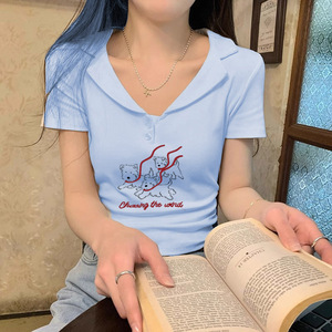 アメリカンホットガールポロシャツ右肩半袖Tシャツレディース2025年夏新作ミルクブルーウエストプリーツユニークトップ
