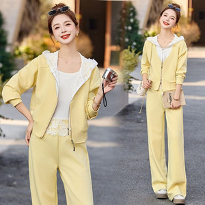 ツーピースファッション 2025 新しいスウェットシャツフード付きジッパージャケット偽ツーピースカジュアルワイドレッグストレートパンツスーツ女性のための