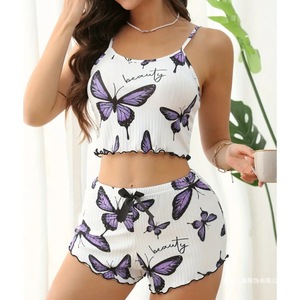 跨境新款蝴蝶印花套装吊带短裤两件套睡衣纯欲可外穿女款家居服