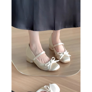 芭蕾风内增高缎面粗跟蝴蝶结玛丽珍鞋女2025年软底一字带高跟单鞋