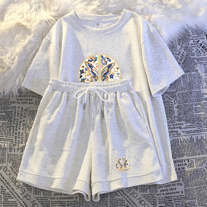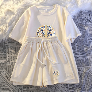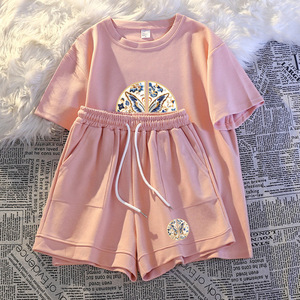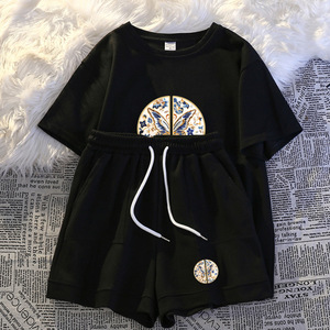 仿棉索罗娜休闲运动套装女宽松大码短袖胖mm印花两件套潮