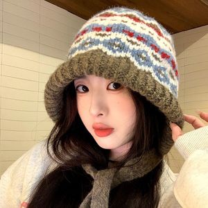 包包帽文艺复古提花针织帽秋冬韩系百搭保暖护耳堆堆帽绑带毛线帽