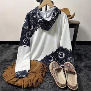 热卖女士休闲时尚圆领套头帽衫西部民族风复古印花女上衣帽衫