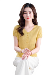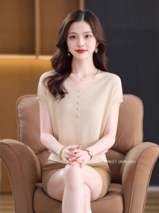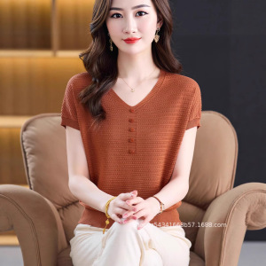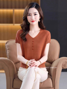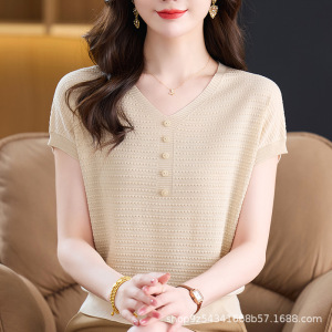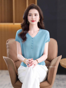 夏季冰丝针织短袖t恤女2025年新款时尚百搭V领薄款舒适T恤上衣女