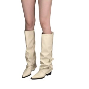 皮带扣~裤筒靴粗跟靴子长靴女欧美辣妹高筒靴尖头黑色裤管靴炸街