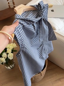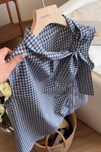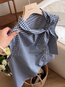 法式蝴蝶结系带无袖格子衬衫女2025新款夏季茶里茶气别致小衫上衣