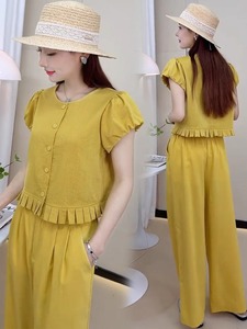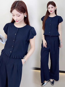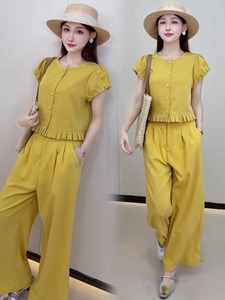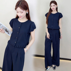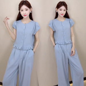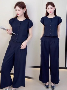 夏のファッショナブルな小柄な人向けのスーツ、スタイリッシュなデザインのショートトップ、背が高く見えるワイドレッグパンツの2点セット A5216