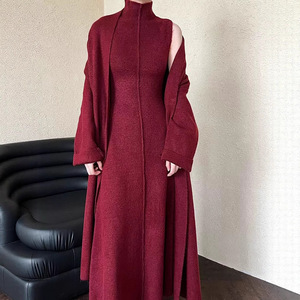 国境を越えた貿易レイジースタイルロングニットカーディガンセータースーツ女性の秋冬新作ハイカラードレス2点セット