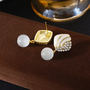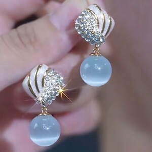 白色猫眼石贝壳镶钻耳环女法式时尚气质耳钉女高级感复古耳饰品女