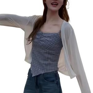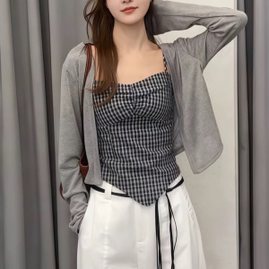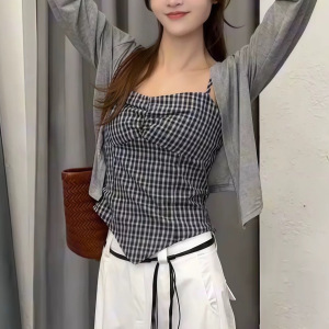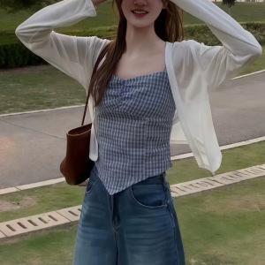2025夏季辣妹风设计感格子不规则显瘦吊带背心防晒衫时尚套装