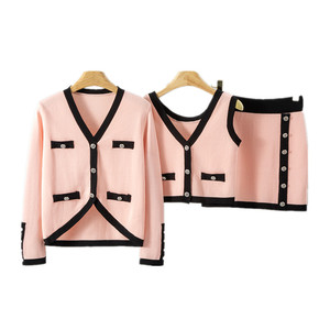 25年早秋新款拼色针织开衫套装女秋冬长袖优雅短款上衣包裙三件套