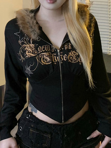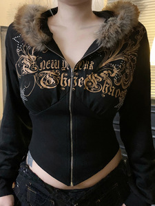 新品Y2K印花休闲通勤撞色带帽拼接紧身收腰不规则毛毛卫衣外套