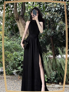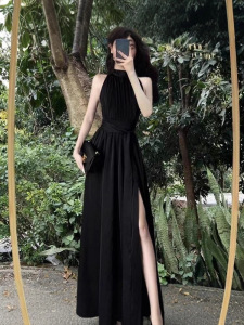 女性のためのハイエンドブラックホルターネックノースリーブドレス 2025 夏の新しいフレンチスタイルスリットウエストロングスカート