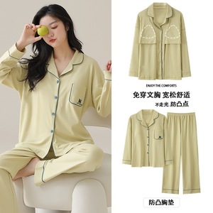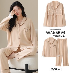 胸パッド付き女性用パジャマ、秋の純綿長袖ズボンカーディガン、甘くてかわいい春と秋の女性用ホームウェアセット
