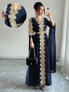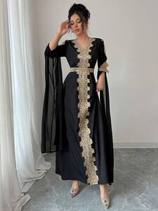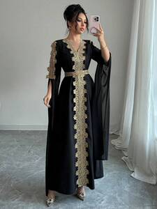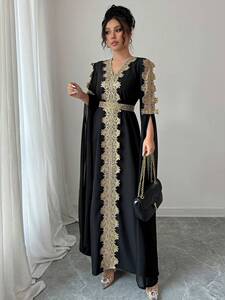 中東ドバイ風エレガント刺繍ロングドレスVネック超長袖ガウンワンピース気品通勤既製品卸売