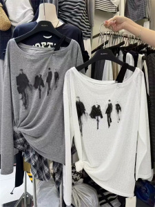 韩版宽松露肩人物印花长袖T恤女2025夏季新款慵懒风减龄百搭上衣