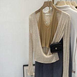 品牌现货时尚假两件蕾丝拼接长袖挂脖针织衫女夏韩系显瘦设计感女
