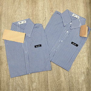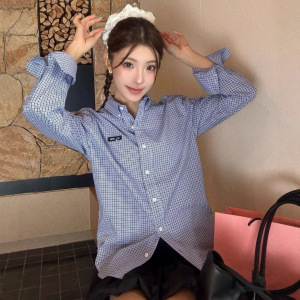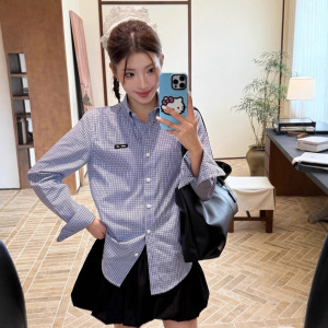 南油高货原标早秋新款MIU家学院风字母徽标贴饰格纹衬衫蓝色衬衣