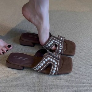 羊皮版~2025夏季新款真皮铆钉方头露趾凉拖鞋一字带时装百搭女鞋