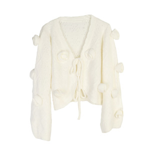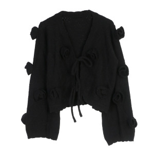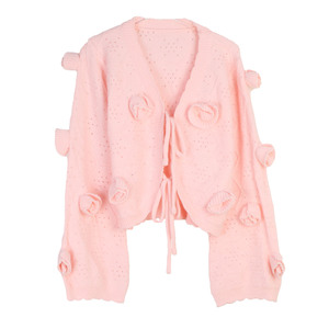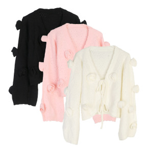欧美花朵毛衣早秋新款温柔甜美立体针织开衫纯色韩版V领毛衣针织