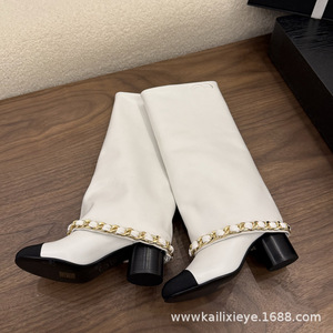 2025小香新品走秀款翻口大链条粗跟裤管靴真皮长靴高跟高筒靴女靴