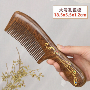 金丝檀木梳-彩绘孔雀翎-长柄款-无包装