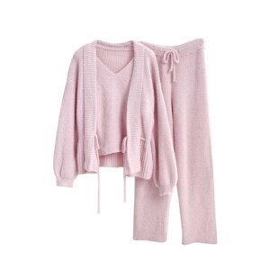 睡衣女秋冬条纹三件套软绵绵绑带背心针织可外穿气质名媛家居服