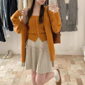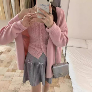 秋季韩系慵懒风麻花针织两件套装背心+v领宽松简约纯色开衫外套女