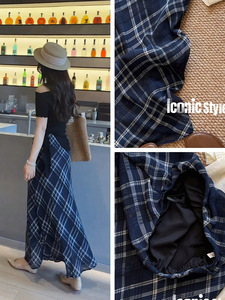 レトロ文学ブルースライトガーゼテクスチャチェック柄スカート女性の夏のスリムチェック柄ロングスカート A5072
