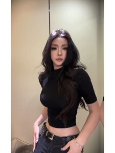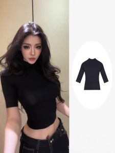 学院风黑色半高领中袖五分袖t恤女2025夏季洋气炸街打底内搭上衣