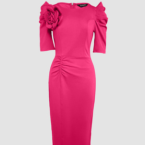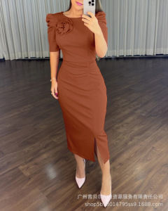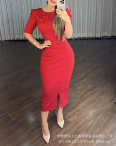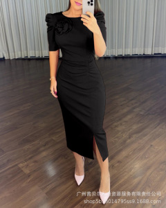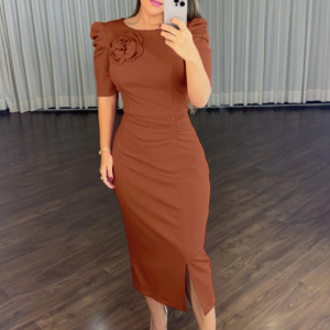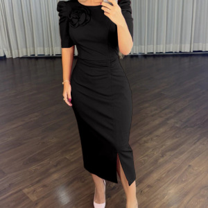 ODL2279 欧米パフスリーブ立体フラワープリーツスリットワンピース