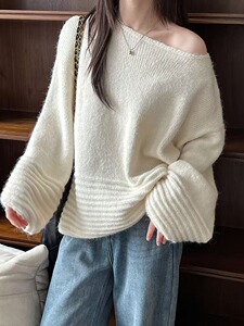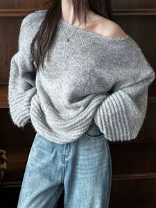 套头毛衣女秋冬慵懒斜领露肩长袖宽松软糯针跨境外贸织衫衫上衣女