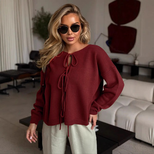 亚马逊跨境新款系带针织开衫2025秋季新款宽松圆领长袖外贸毛衣女