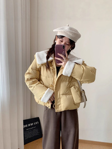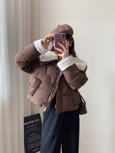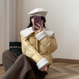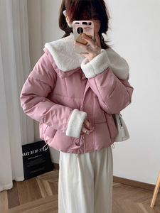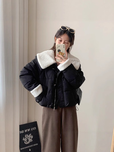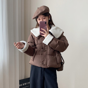 今年流行2025冬新款法式娃娃领撞色时尚拼接盘扣短款棉服长袖外套