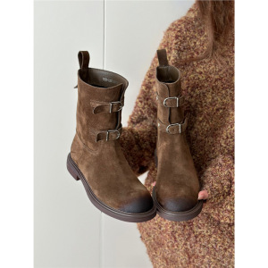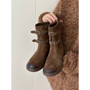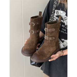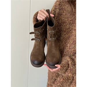 羊皮版~复古擦色皮带扣西部牛仔靴显瘦短靴女美拉德马丁靴机车靴