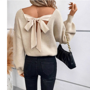 欧美跨境女装v领纯色毛衣 秋季外贸新款长袖休闲宽松蝴蝶结上衣女