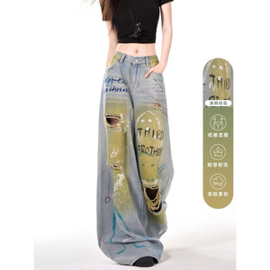 【广州新塘牛仔】 复古涂鸦阔腿牛仔裤女夏季高腰宽松直筒拖地裤