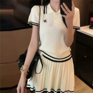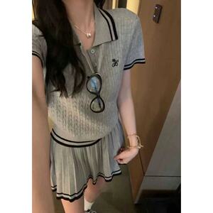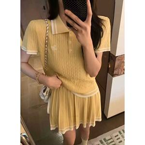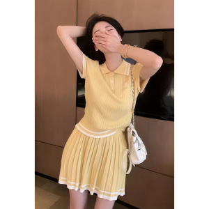 韓国版の新しい夏スタイルの年齢軽減カレッジスタイルのカラーブロックポロカラーセーター+スリムプリーツスカートスーツ