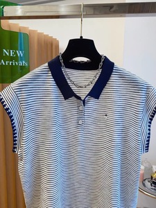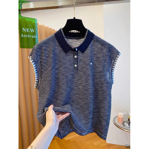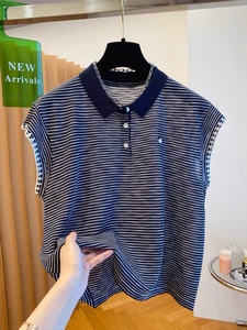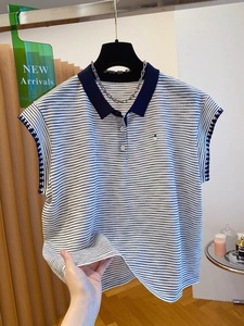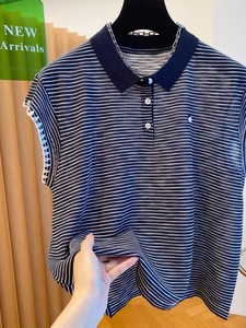 韩国高级感条纹针织t恤女短袖2025新款宽松别致小飞袖POLO领上衣