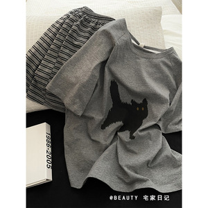 [在庫あり] 韓国スタイルカジュアル子猫半袖パジャマ女性のための夏 2025 新しいストライプショーツホームウェアセット