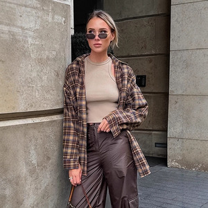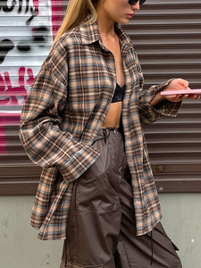 2025欧美女装时尚复古格纹衬衫女长款设计感打底格子衬衣宽松上衣
