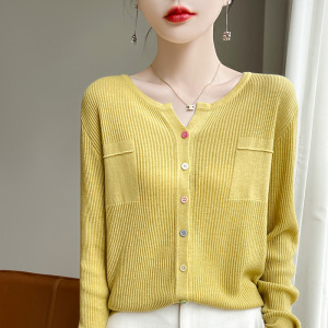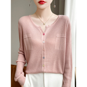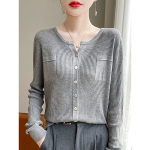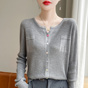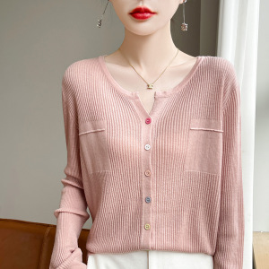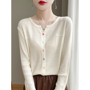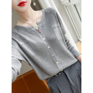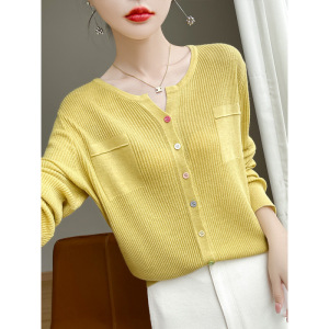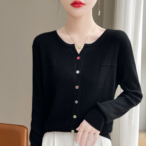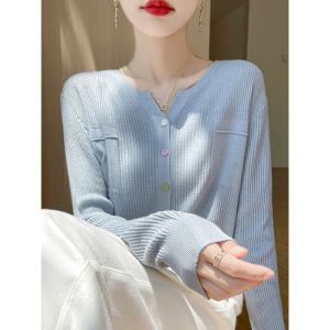 春秋季新款韩版精纺羊毛V领针织开衫女彩扣假兜设计感薄外套毛衣
