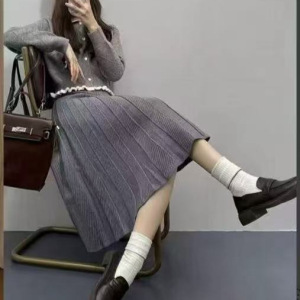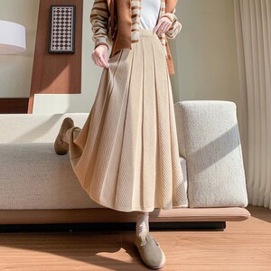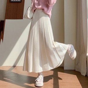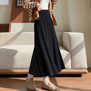 韓国風2025秋冬魚鱗柄カバーヒップニットスカートレディースハイウエストAライン大裾スカートミドル丈プリーツスカート