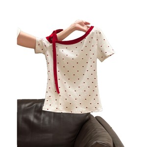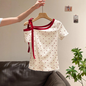 美式爱心波点斜露肩短袖t恤女夏季2025新款修身绑带甜辣妹上衣潮