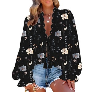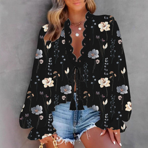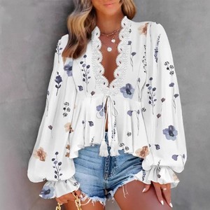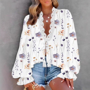 2025春秋跨境新款亚马逊wish欧美女装V领蕾丝拼接印花衬衫衬衣女