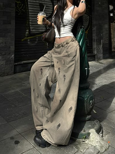 美式街头复古做旧涂鸦宽松牛仔裤女跨境低腰松弛感镰刀裤阔腿裤