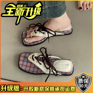 ファッショナブルで多用途なアーティスティックスタイルのスクエアトゥチェック柄厚底ビーチサンダル女性用2025夏ビーチサンダルホリデースリッパサンダル