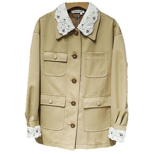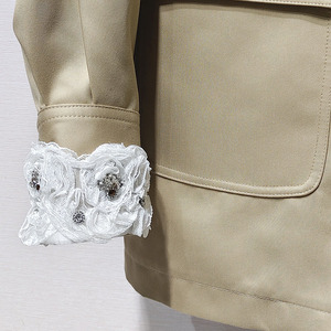 1件起批2025秋女装 重工蕾丝刺绣镶钻单排扣工装风衣外套S250604