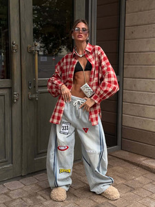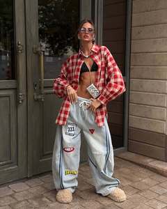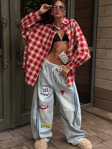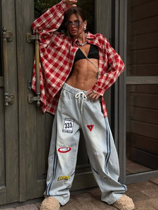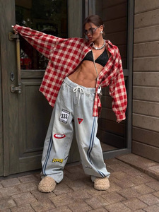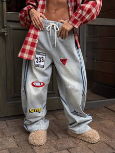 クロスボーダーストリートデザインホットガールワイドレッグスナイパージーンズデザイン刺繍コントラストカラー巾着フロアレングスパンツ